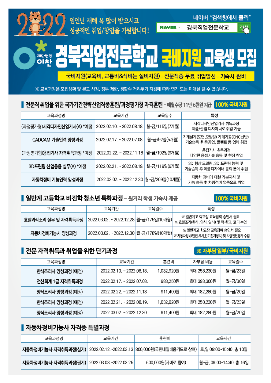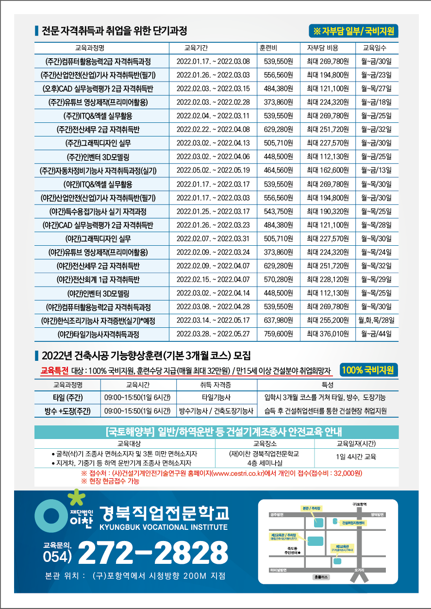 포항 경북직업전문학교에서 국비지원 교육생을 아래와 같이 모집하고 있습니다.