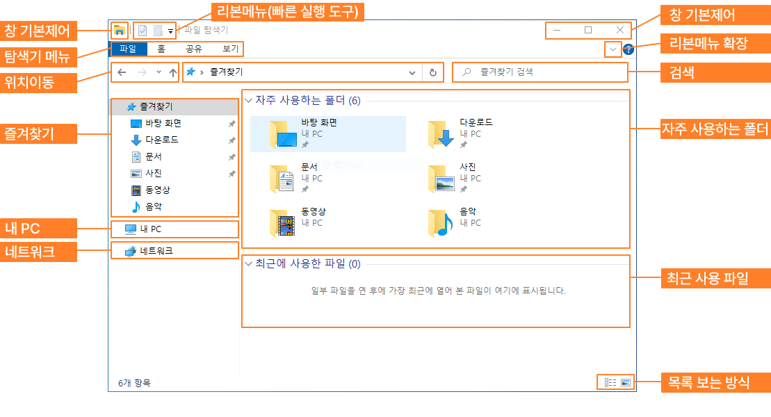 윈도우에서 파일 관리를 위해 제공하는 파일 탐색기의 화면 구성입니다.