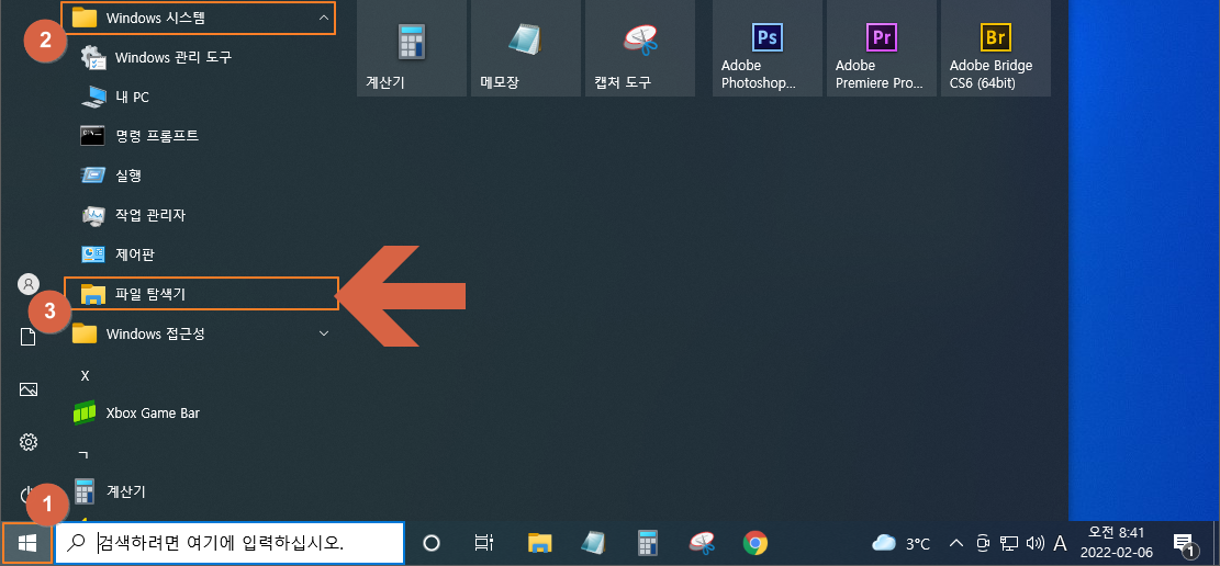시작버튼을 눌러 나오는 메뉴에서 [Windows 시스템] 항목을 펼치면 '파일 탐색기' 가 나옵니다.