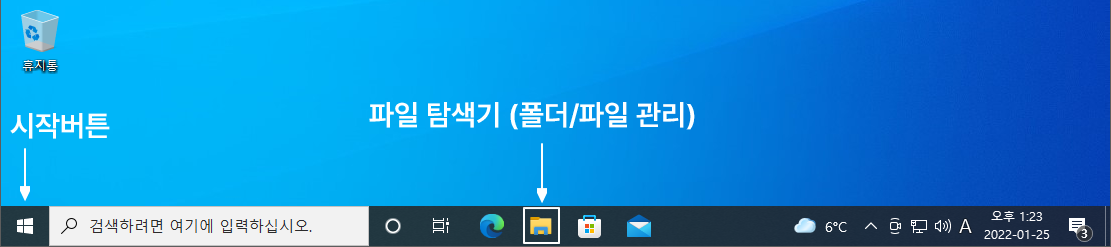 시작줄 가운데에 위치하고 있습니다. 바탕화면의 폴더 또는 문서(사용자 기본 폴더)를 열면 기본적으로 탐색기가 실행되면서 폴더가 열립니다.