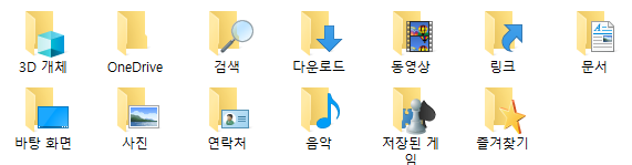 컴퓨터 사용자에게 기본 제공되는 폴더이며, 컴퓨터의 사용자 이름으로 만들어져 있습니다. (사용자 이름 변경가능) 이 중, 다운로드/문서/바탕화면/사진/음악 폴더는 컴퓨터 사용할 때 기본으로 같이 사용하는 폴더입니다. ![]() |