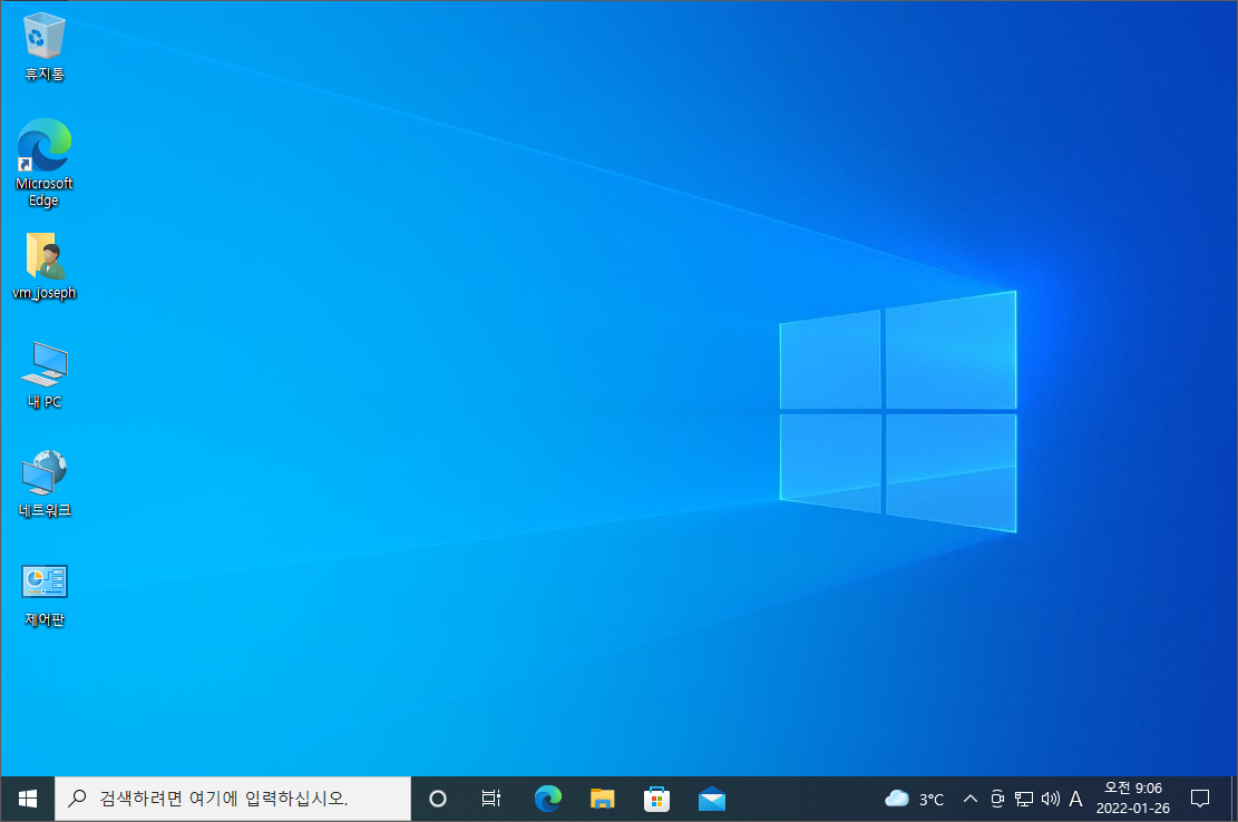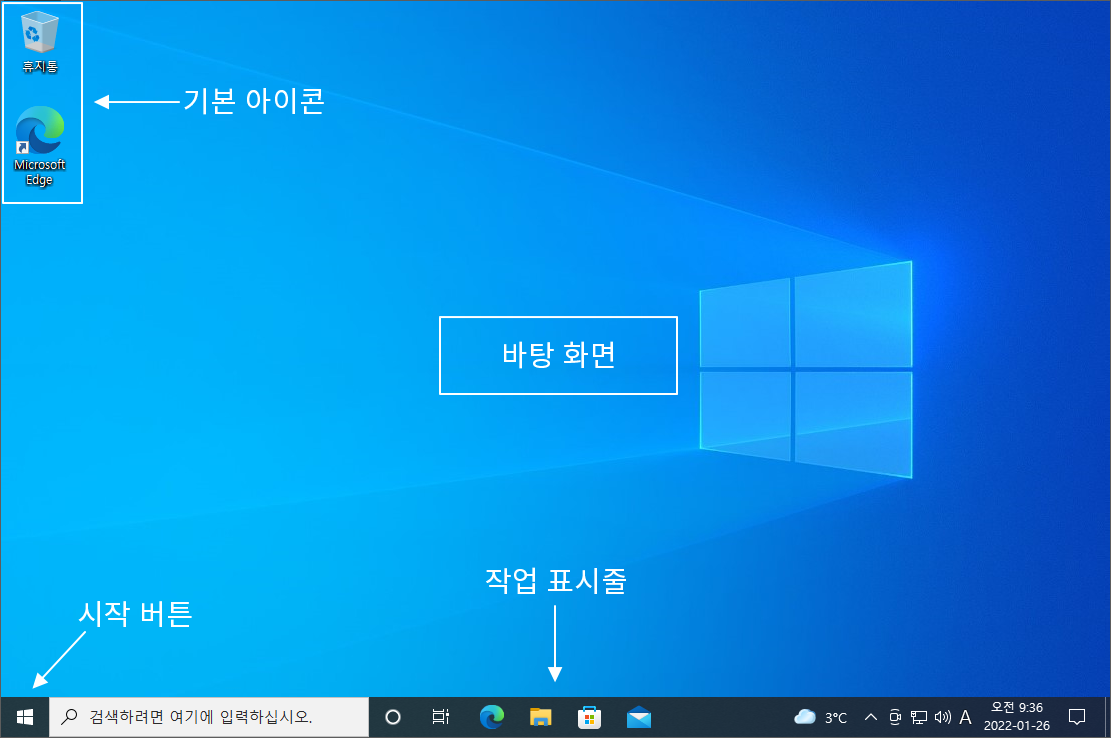 처음 윈도우를 설치하면 아래와 같이 바탕화면에 2개의 아이콘(휴지통, 웹 브라우저)과 화면 아래 시작 버튼 및 작업표시줄이 배치되어 있습니다.