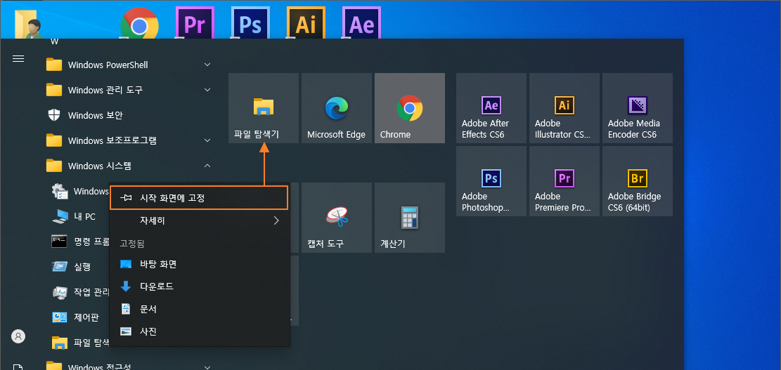 시작 - Windows 시스템 - 파일 탐색기 항목을 마우스 오른쪽 버튼으로 클릭 후 '시작 화면에 고정'을 선택하면 아래와 같이 시작화면의 타일로 꺼내어 고정할 수 있습니다.