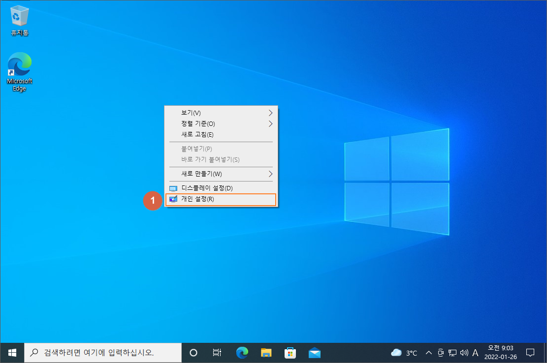 ① 바탕화면에서 마우스 오른쪽 버튼을 클릭하여 열리는 메뉴창에서 '개인 설정(R)'을 선택합니다.