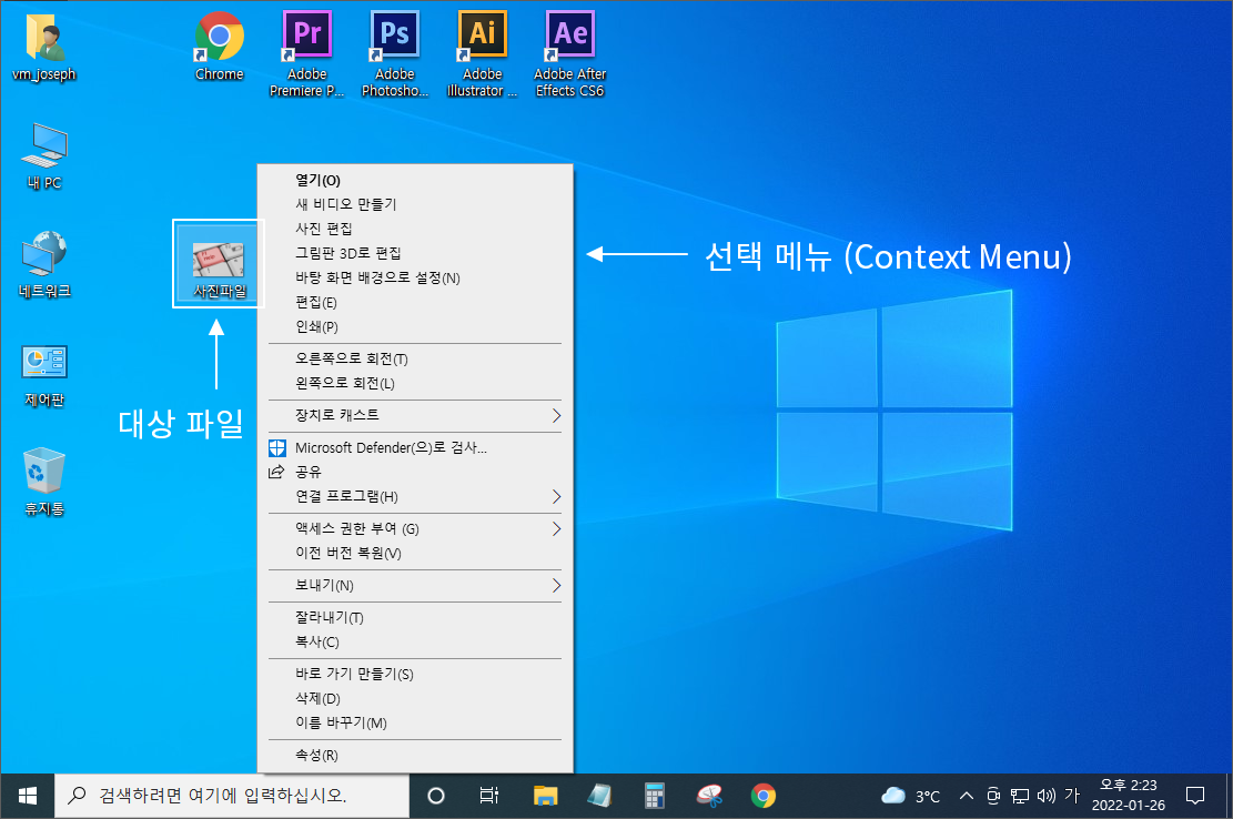 어떠한 기능을 사용하기 위한 메뉴(Context Menu)를 호출하기 위해 사용 예를 들어, 파일을 삭제 또는 복사하거나 이름을 바꾸는 등의 기능을 사용하기 위해 대상 파일을 오른쪽 버튼으로 클릭하여 나오는 메뉴에서 기능을 선택하여 원하는 기능을 수행합니다. |