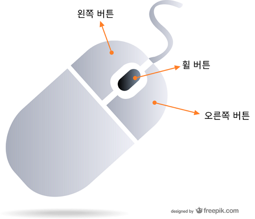 일반적으로 컴퓨터 마우스는 두 개의 버튼과 한 개의 휠 버튼을 갖고 있습니다.