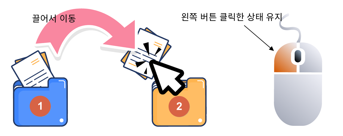 파일과 폴더 또는 문서에서 일부분의 내용을 선택하여 다른 곳으로 이동시키는 동작으로, 마우스 왼쪽 버튼을 클릭하고 있는 상태에서 진행합니다.