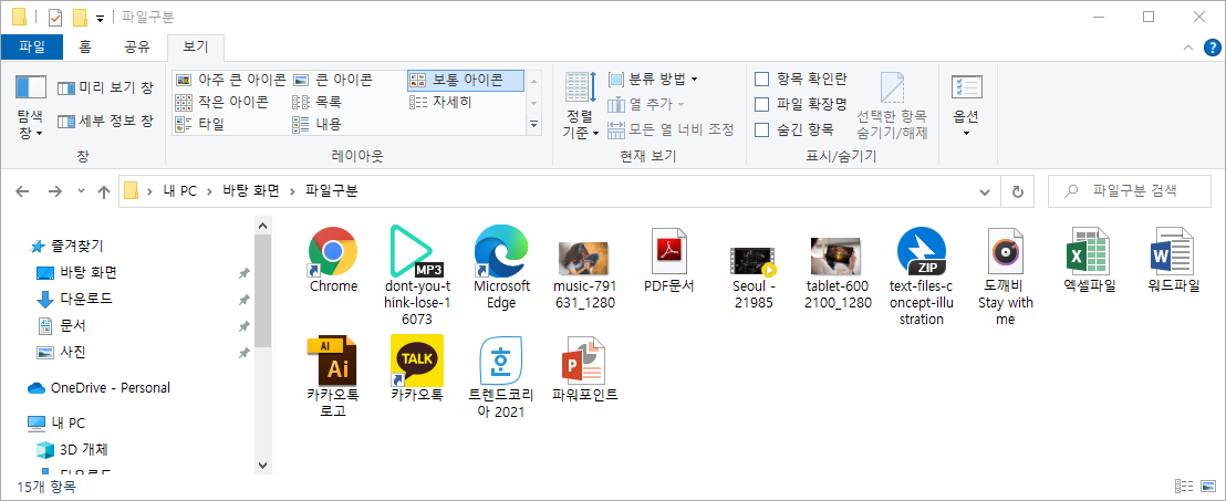 목록 보기 형식을 '보통 아이콘'으로 선택하면 아래와 같이 아이콘파일 이름만 보여서 아이콘으로만 형식을 구분하여야 하므로 파일 이름과 아이콘으로 구분하는데 익숙하지 않다면 원하는 파일을 찾아서 사용하기가 어려울 수 있습니다.