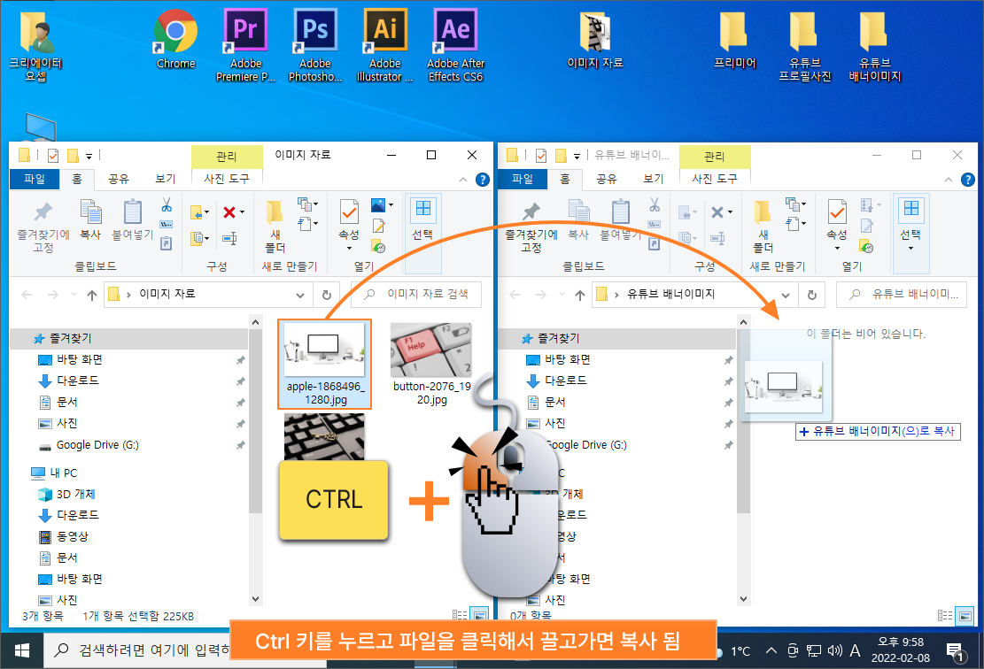 아래와 같이 바탕화면의 '이미지 자료' 폴더에 있는 사진 파일 한 개를 '유튜브 배너 이미지' 폴더로 복사한 모습입니다. 이렇게 복사를 하면 '이미지 자료' 폴더 안의 원본 파일은 그대로 남아 있고 복사 대상 폴더에 같은 파일이 새롭게 만들어집니다.