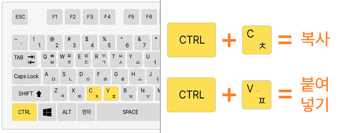 아래 그림과 같이 키보드의 CTRL(컨트롤) 키를 누른 상태에서 C 또는 V 키를 눌러서 복사 작업을 수행할 수 있습니다.