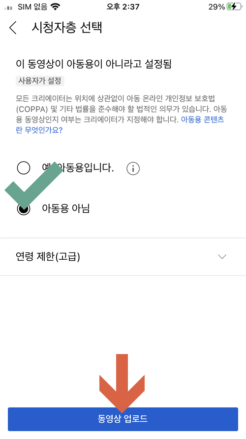 ⑥ 아동용 아님 선택 후 [ 동영상 업로드 ] 버튼을 누릅니다.