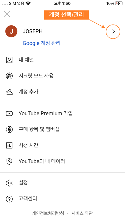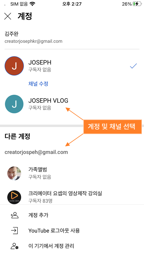 개인채널과 브랜드 채널이 있고 두 개 이상의 구글 계정이 폰에 등록되어 있다면 [ 계정 선택/관리 ] 버튼을 클릭하여 유튜브용 계정을 선택할 수 있습니다.
