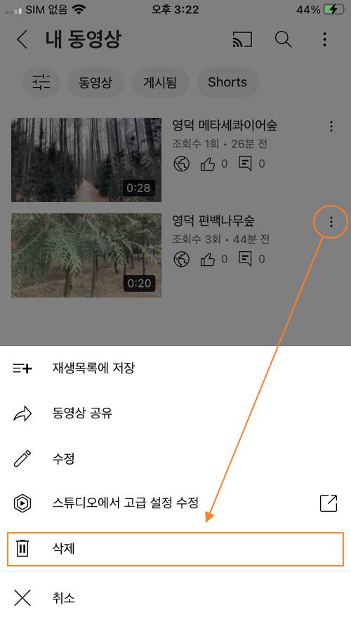 ① 동영상 관리 메뉴에서 [삭제]를 선택합니다.