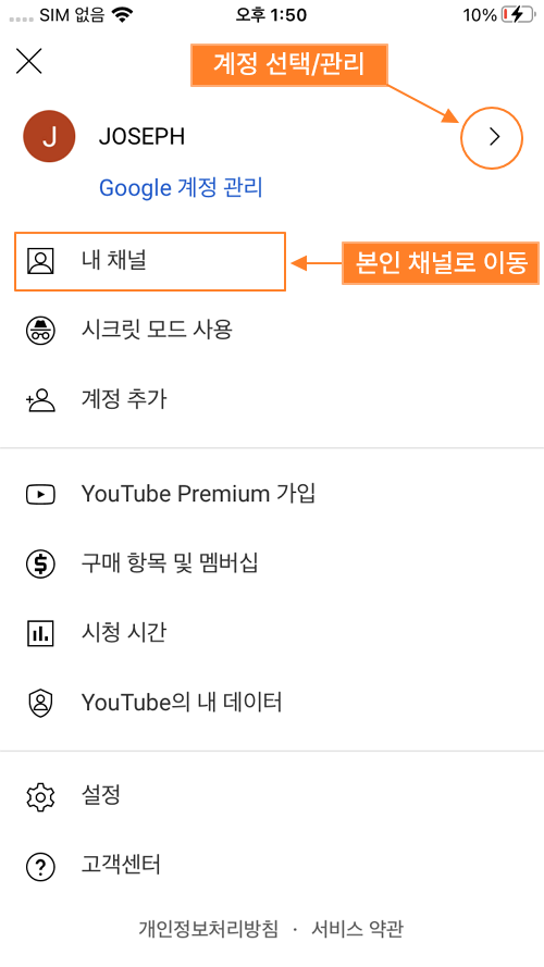 1) 스마트폰의 YouTube 앱에서 내 채널로 들어가기
