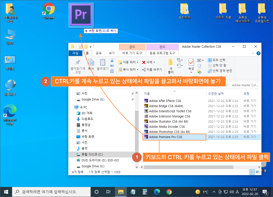 프리미어 프로 등, 자주 사용하는 응용 프로그램(앱)의 아이콘을 바탕화면에 꺼내 놓으면 사용하기 편리합니다.