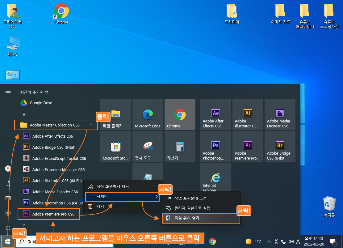 - ③ Adobe Premiere Pro CS6 를 마우스 오른쪽 버튼으로 클릭