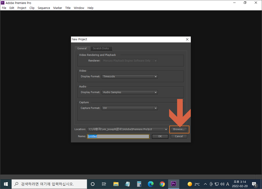 새 프로젝트의 작업 폴더를 지정하기 위해 [Browse] 버튼을 누르세요.