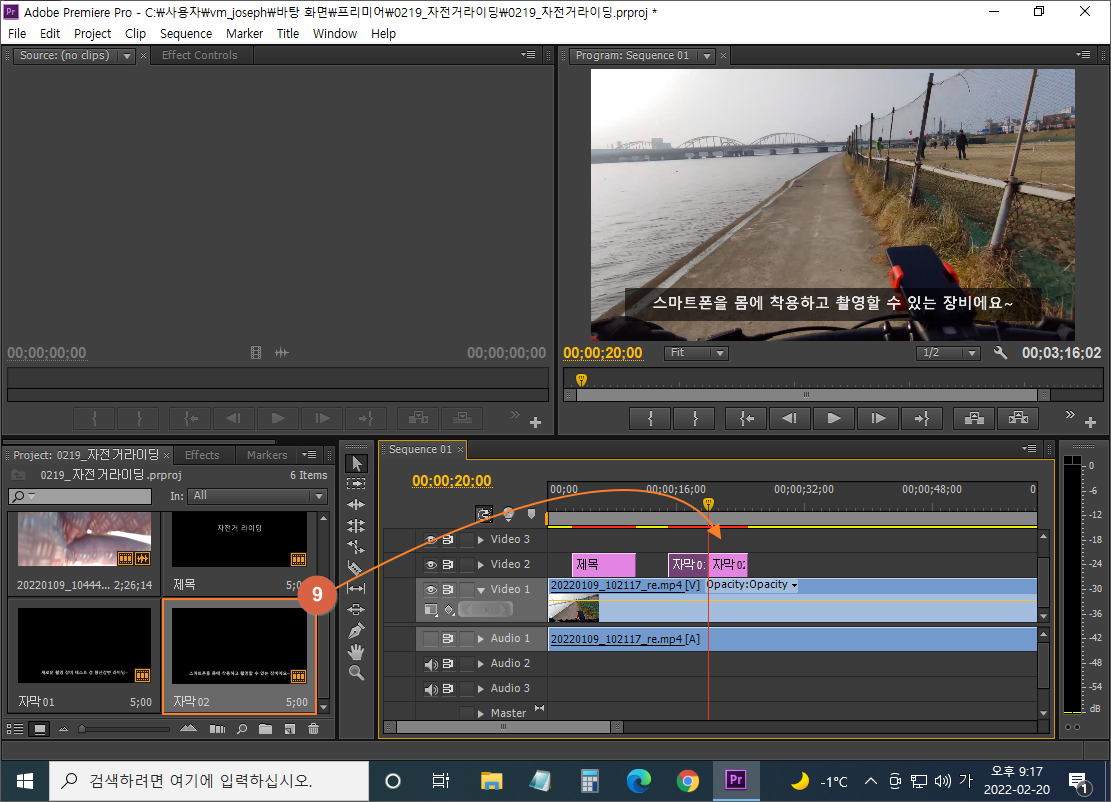 ⑨ 프로젝트 패널 안에 등록되어 있는 두 번째 자막을 타인라인의 재생헤드에 맞춰 올리기