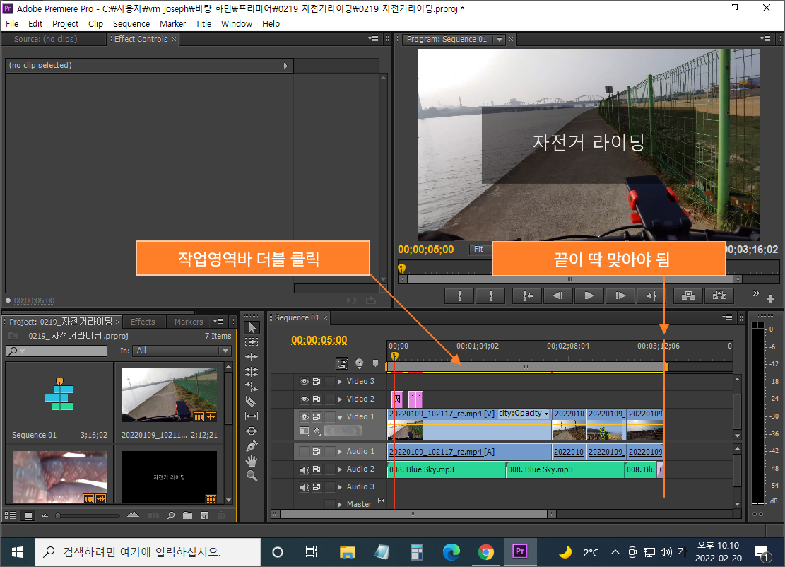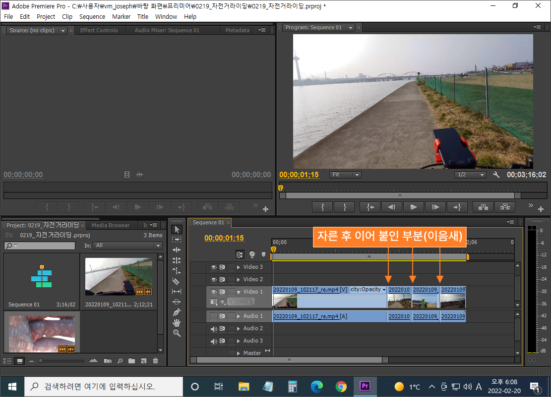 ② 프로젝트 패널의 두 번째 영상소스를 끌고 가서 첫 번째 영상 뒤에 이어 붙입니다.