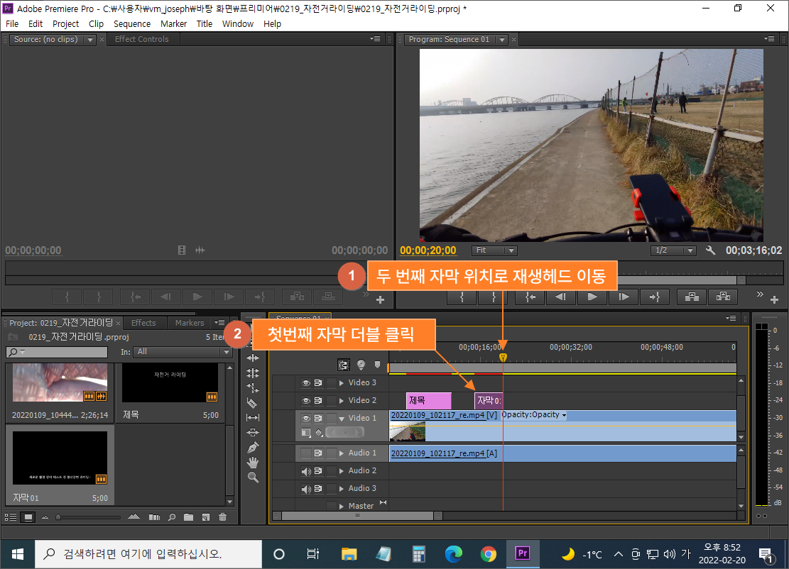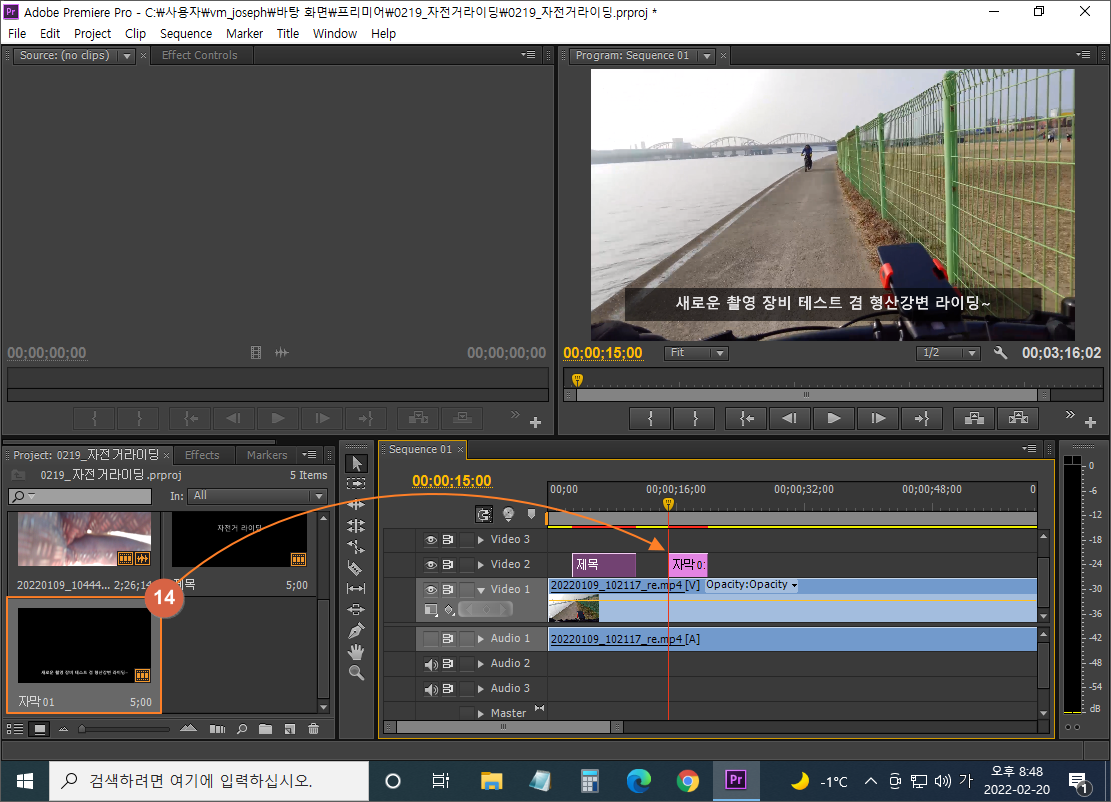 ⑭ 프로젝트 패널에 저장되어 있는 자막을 타임라인의 재생헤드 위치에 맞춰 올리기 (비디오 2트랙)
