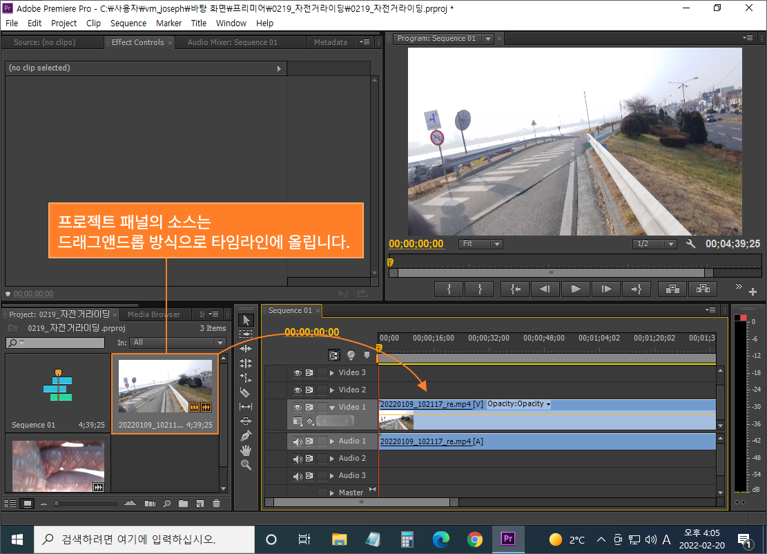 프로젝트 패널에 등록되어 있는 소스를 타임라인에 올리는 방법은 여러 가지가 있지만 대표적으로 프로젝트 패널에서 드래그 앤 드롭(끌어서 놓기) 방식으로 타임라인에 바로 올리는 방법을 사용합니다.