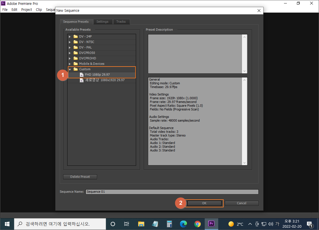 시퀀스는 영상의 규격입니다. 미리 만들어 놓은 FHD 1080p 29.97을 선택합니다. 만약, 세로로 촬영하였으면 세로 영상 시퀀스를 선택하세요.