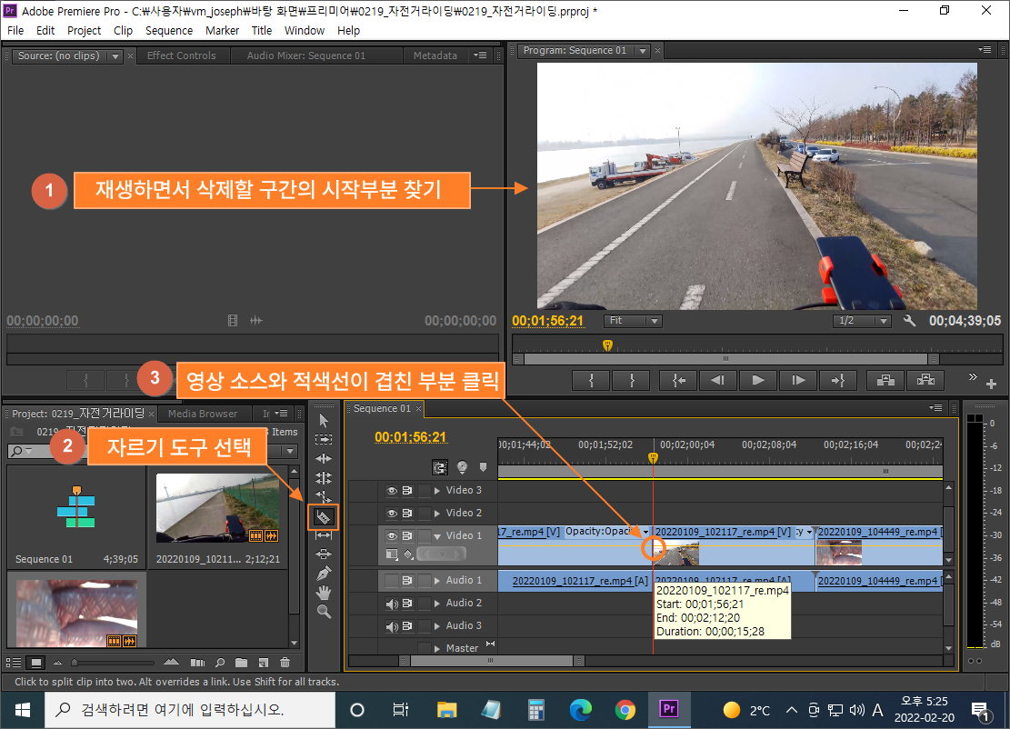① 재생하면서 삭제할 구간의 시작 부분 찾기