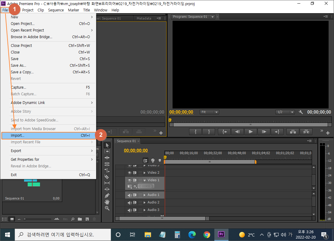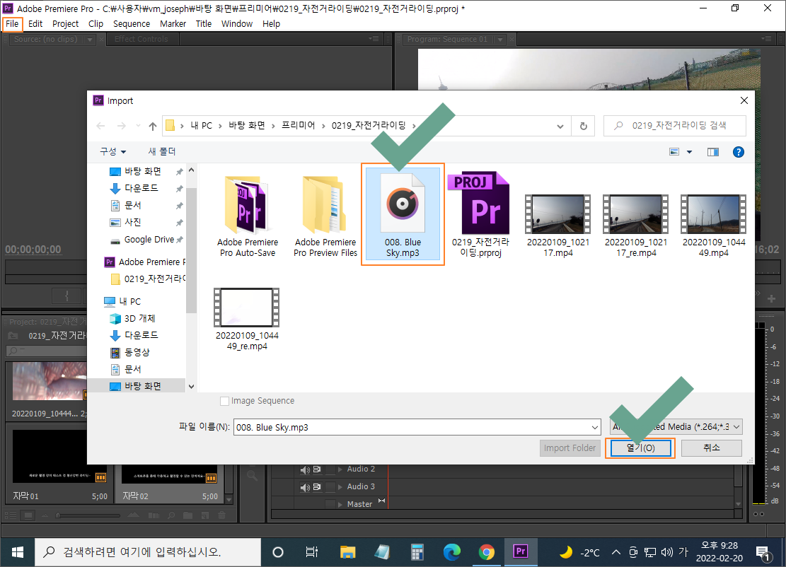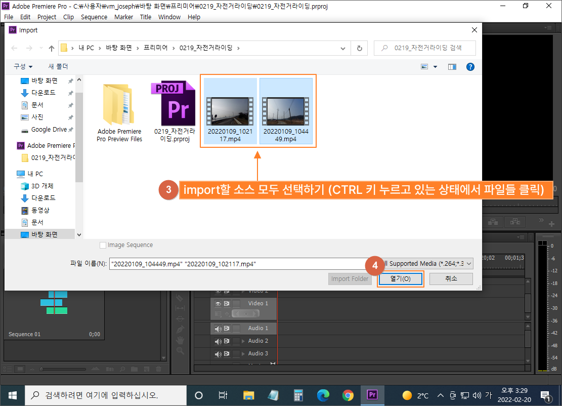 영상을 편집하기 위해서 필요한 파일을 프리미어로 갖고 오는 과정입니다.