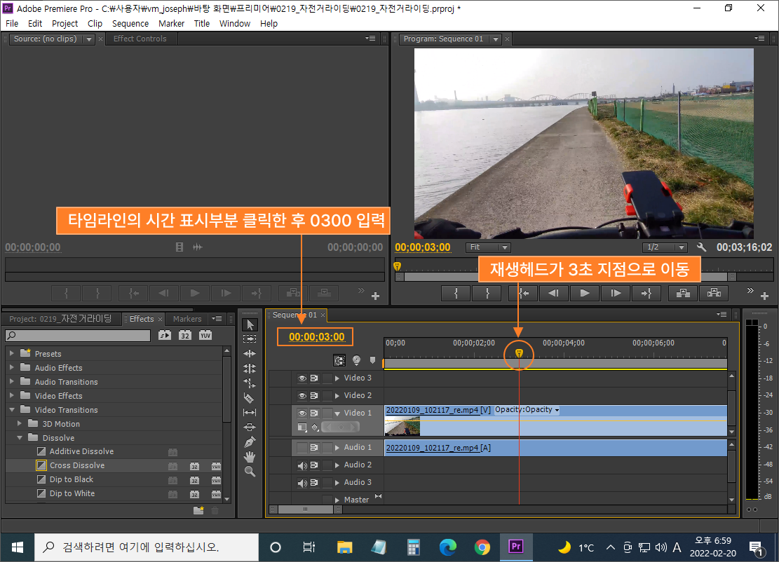 ④ Cross Dissolve 효과를 클릭 후 끌고 가서 타임라인의 영상 클립 사이(이음새)에 놓기
