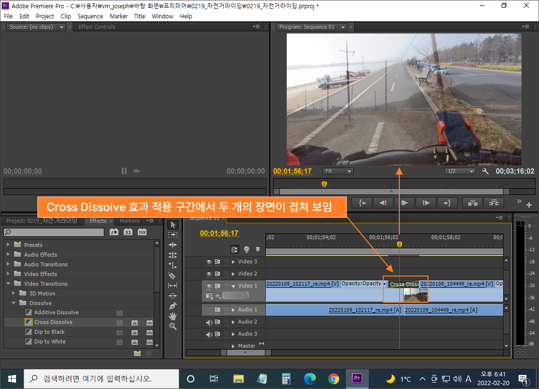 아래 화면과 같이 Cross Dissolve 효과가 적용된 구간에 재생헤드를 옮겨 보면 프로그램 모니터상에 두 개의 영상이 겹쳐 보임을 확인할 수 있습니다.