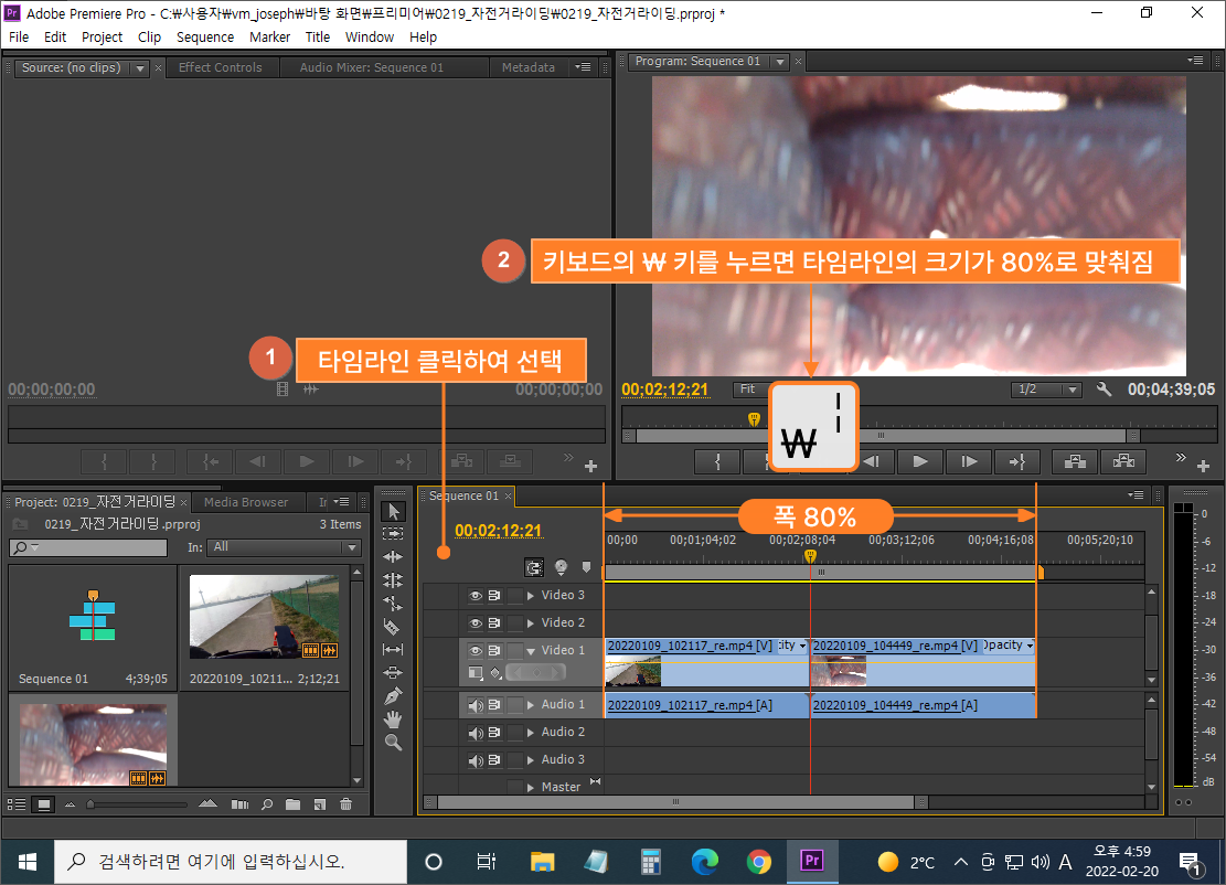 ② 키보드의 [ ₩ ] 키를 눌러서 타임라인의 크기(폭)를 80%로 맞춥니다.