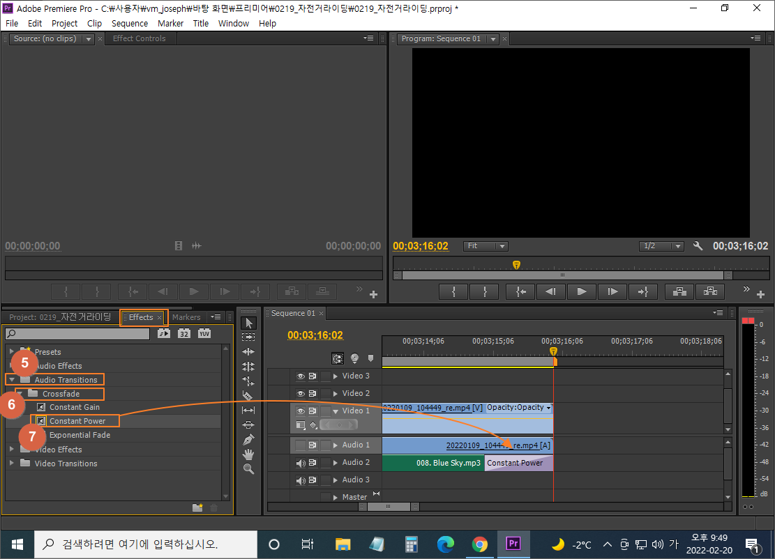 ③ 프로젝트 패널에 등록된 오디오 파일을 끌고 가서 Audio 2 트랙에 올리기