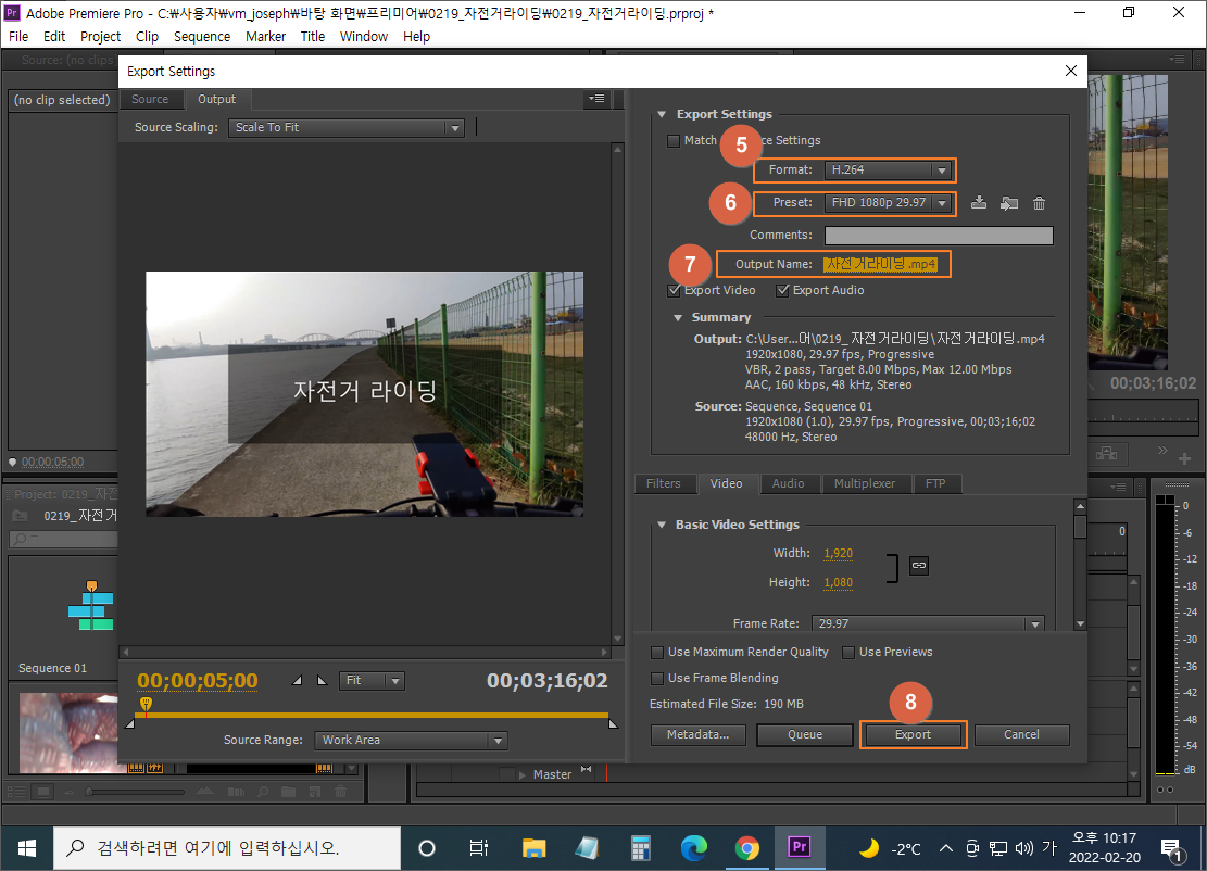 ⑦ Output Name: 동영상 파일 저장 폴더 선택 후 동영상제목 입력