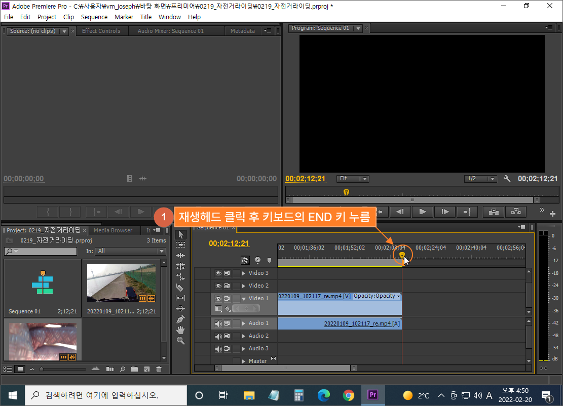 두 번째 영상소스를 첫 번째 영상소스 뒤에 이어 붙이기 위해서는 재생헤드를 첫 번째 영상소스의 맨 뒤로 이동한 후 진행합니다.