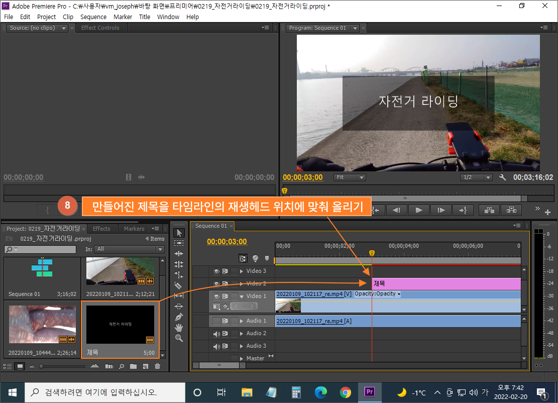 ⑧ 프로젝트 패널에 등록되어 있는 제목을 타임라인의 재생헤드가 있는 위치에 올리기 (비디오 2 트랙)