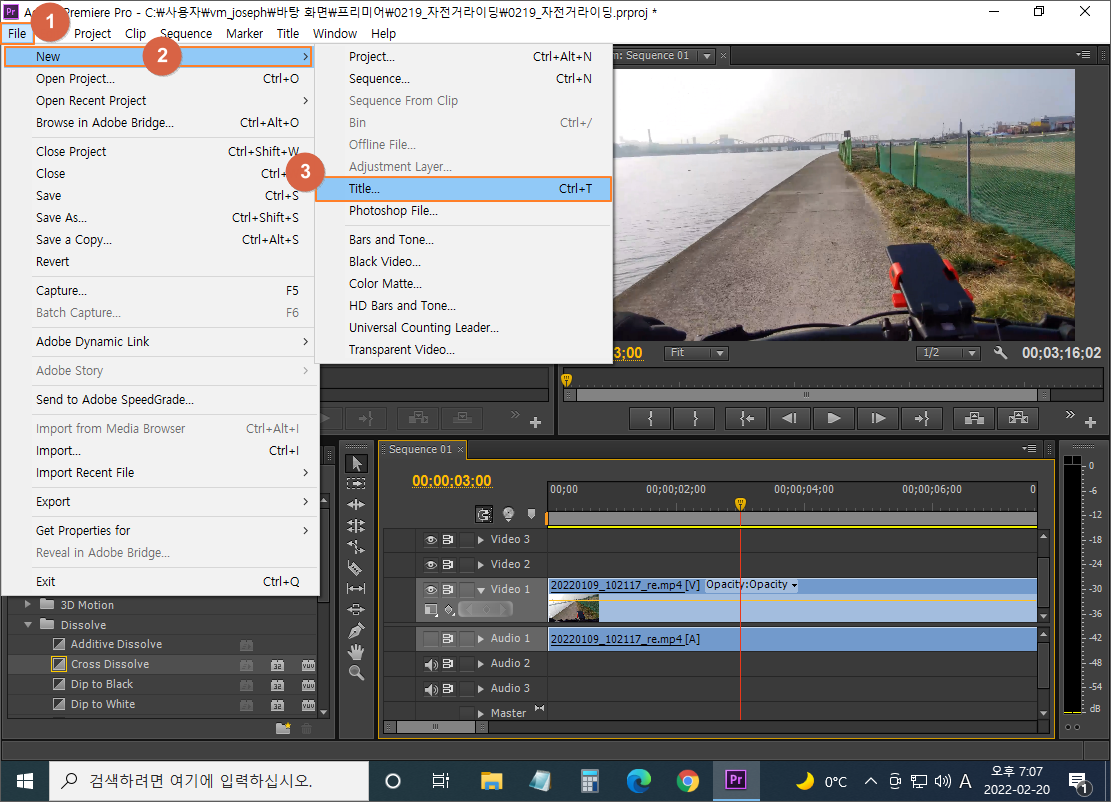 ⑧ 프로젝트 패널에 등록되어 있는 제목을 타임라인의 재생헤드가 있는 위치에 올리기 (비디오 2 트랙)