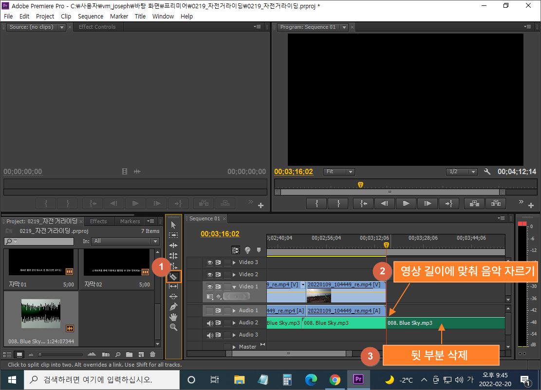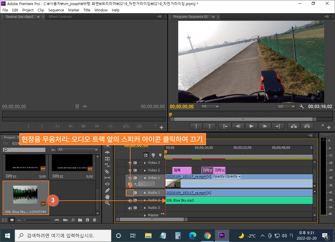 ③ 프로젝트 패널에 등록된 오디오 파일을 끌고 가서 Audio 2 트랙에 올리기