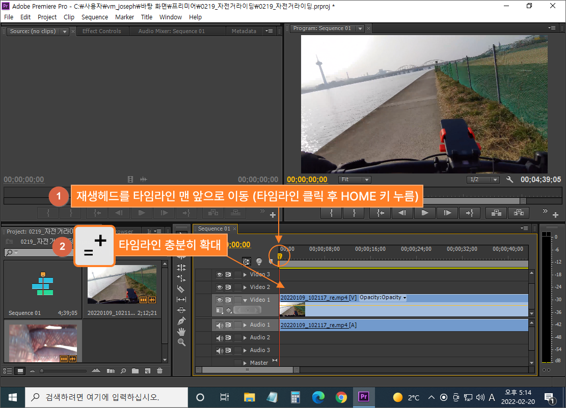 프로젝트 패널의 첫 번째 영상 소스를 끌고 가서 타임라인 앞 쪽에 딱 붙여서 올립니다. (자석 기능으로 인해 근처에 가면 딱딱 붙음)