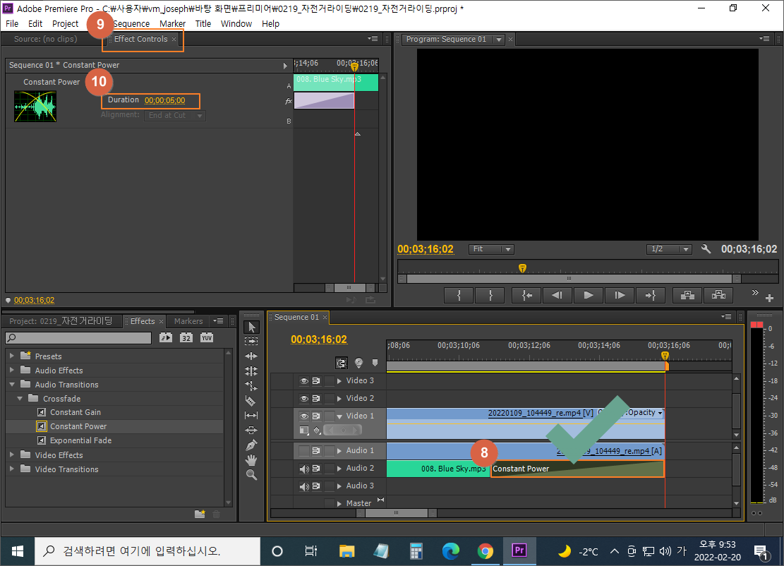 ⑧ 배경음악 끝 부분에 적용되어 있는 Constant Power 클릭 (타임라인을 충분히 확대 후)