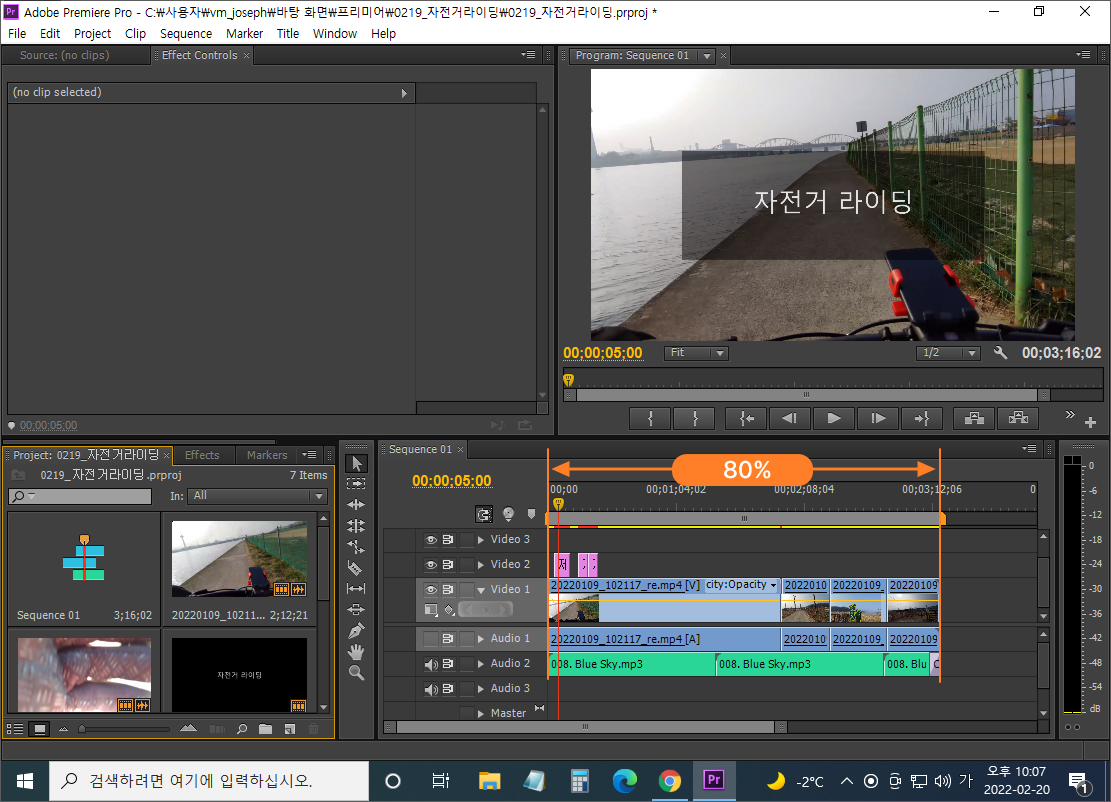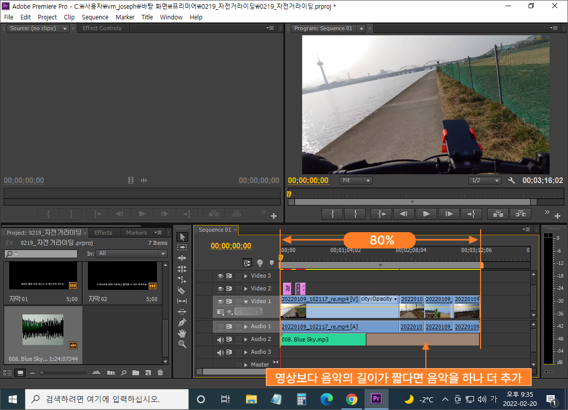 타임라인의 크기를 80%로 맞춰서 영상과 음악의 길이가 맞는지 확인합니다. 만약, 음악 길이가 영상 길이보다 짧으면 같은 음악을 한번 더 사용하거나 다른 음악을 구해서 사용할 수 있습니다.