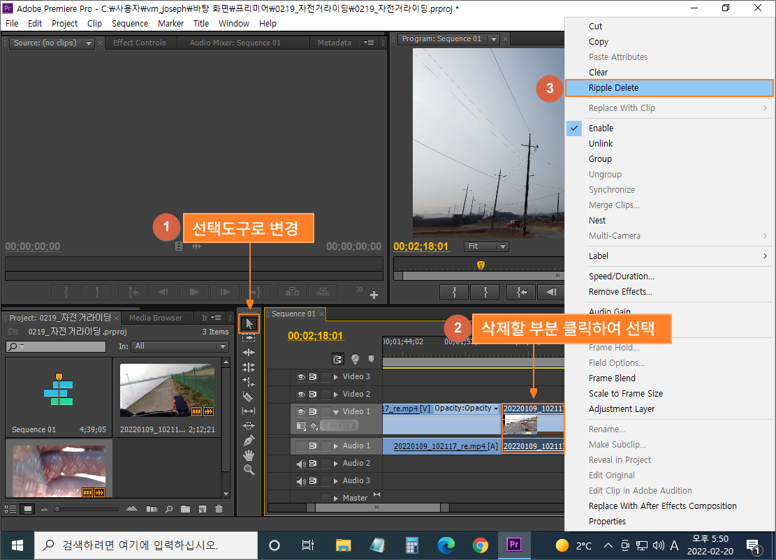 ③ 선택한 클립을 마우스 오른쪽 버튼을 클릭 후 [Ripple Delete] 선택 (단축키 - Win: Shift + Delete / Mac: Option+Delete)