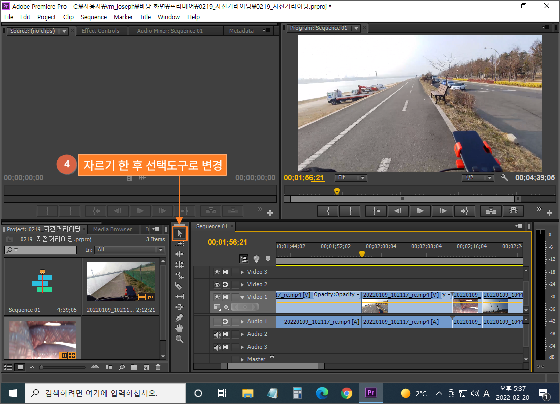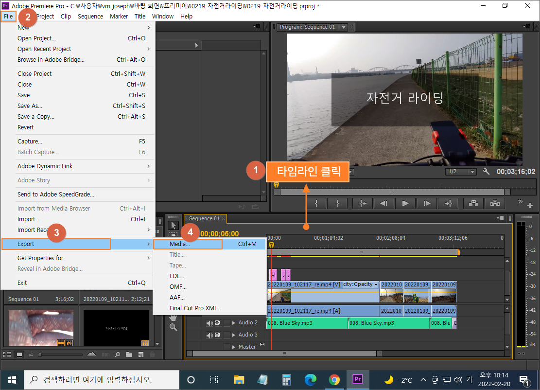 영상을 편집하기 위해서 필요한 파일을 프리미어로 갖고 오는 과정입니다.