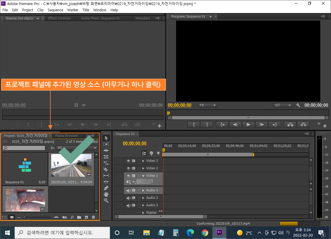 아래 화면과 같이, 프로젝트 패널에 영상 소스가 추가되었습니다.