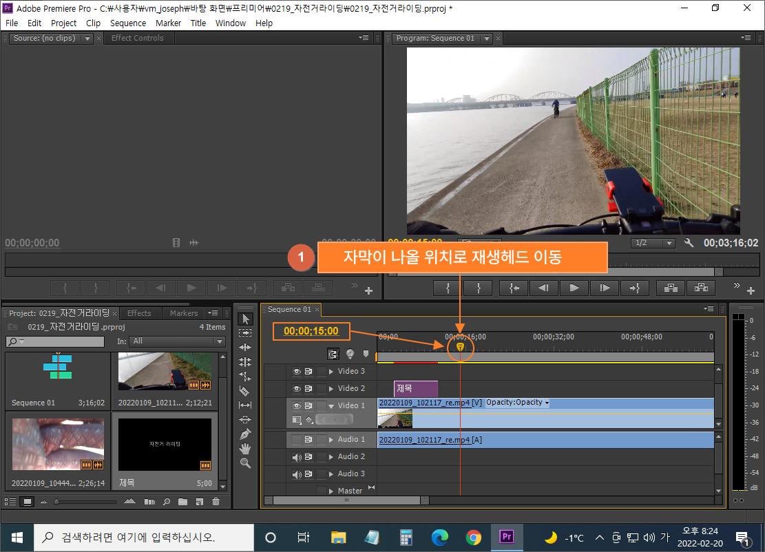⑭ 프로젝트 패널에 저장되어 있는 자막을 타임라인의 재생헤드 위치에 맞춰 올리기 (비디오 2트랙)