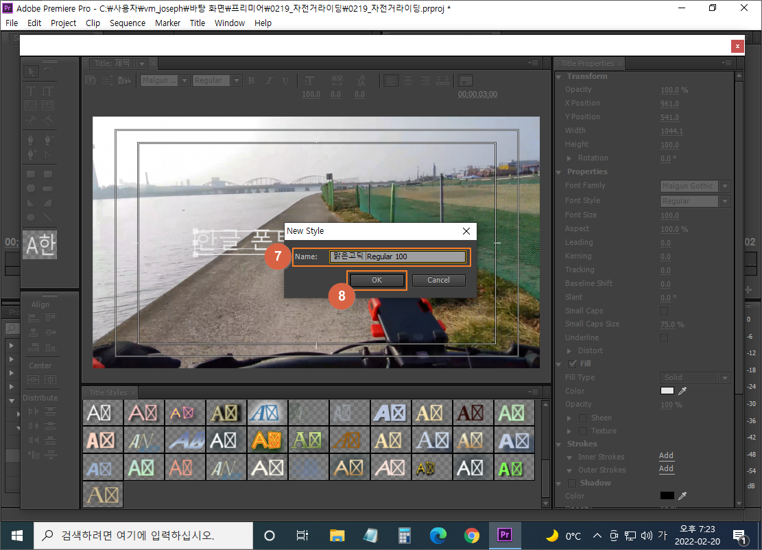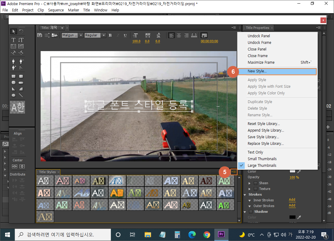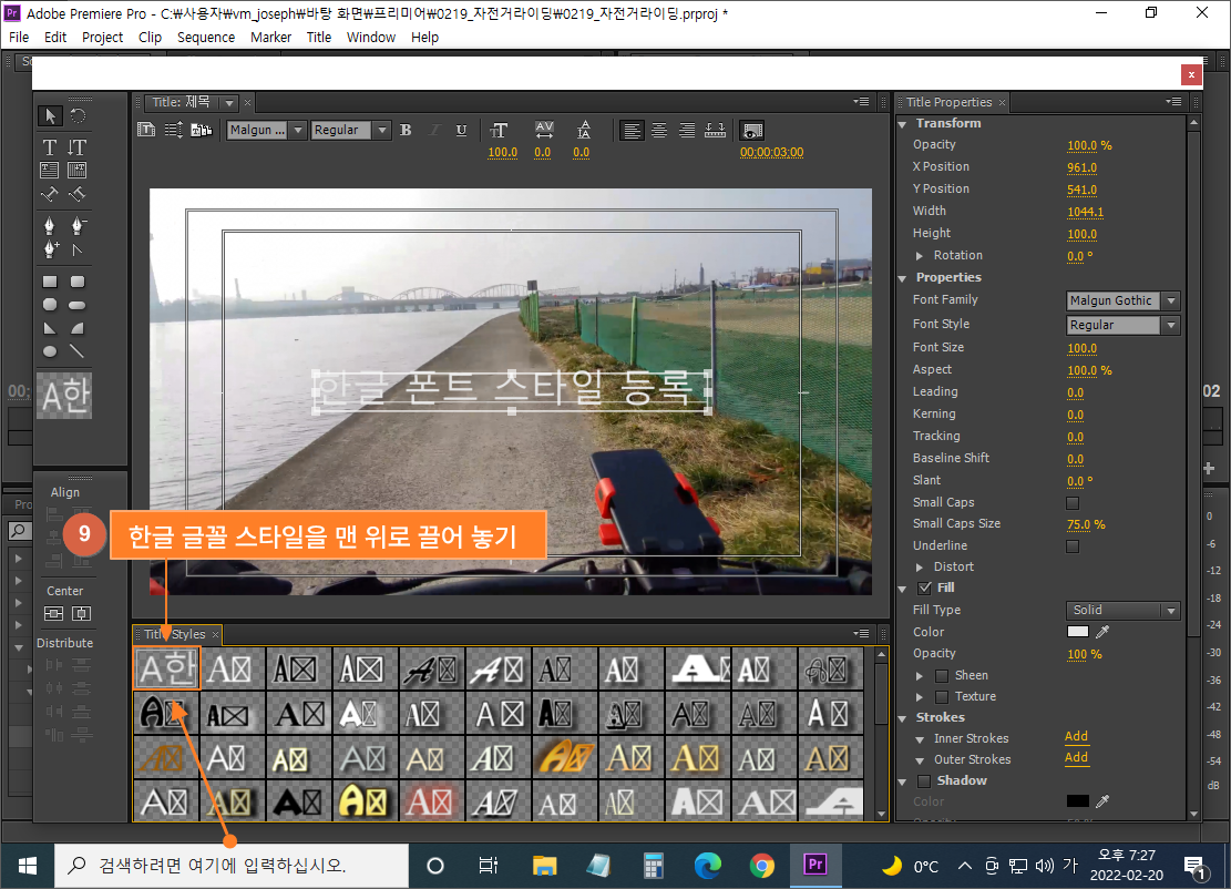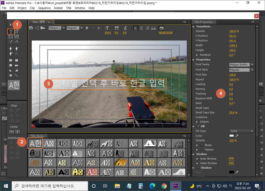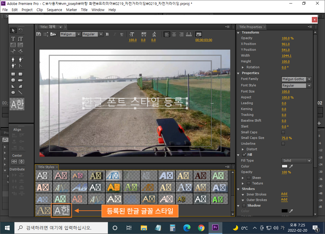 프리미어 프로의 타이틀러는 한글 글꼴을 바로 사용할 수 없는 불편함을 갖고 있으며 이를 해소하기 위해서 스타일 기능을 활용하고 있습니다.