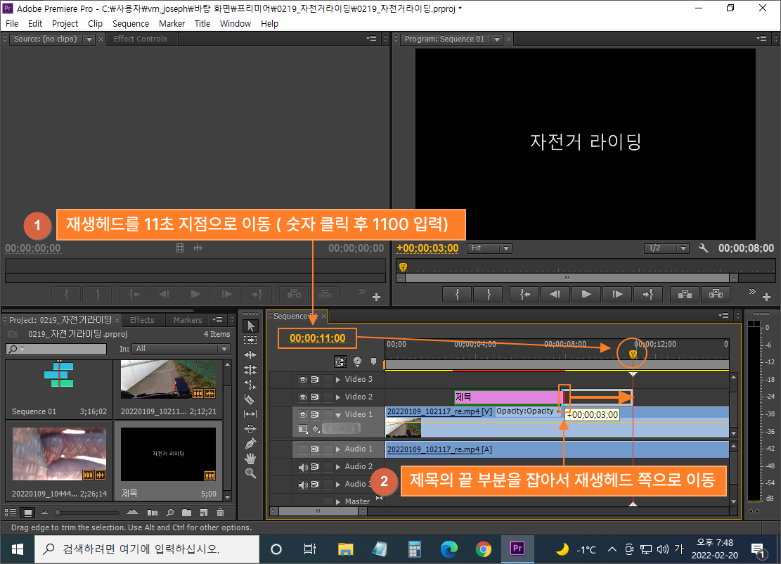 타임라인에 올려 놓은 타이틀(제목/자막) 클립의 끝 부분을 잡아서 직접 길이를 조절할 수 있지만, 정확한 조절을 위해 재생헤드를 먼저 이동시켜 놓은 후 진행하겠습니다.