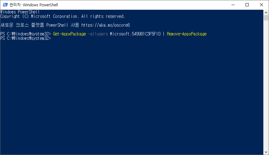 명령문: Get-AppxPackage -allusers Microsoft.549981C3F5F10 | Remove-AppxPackage