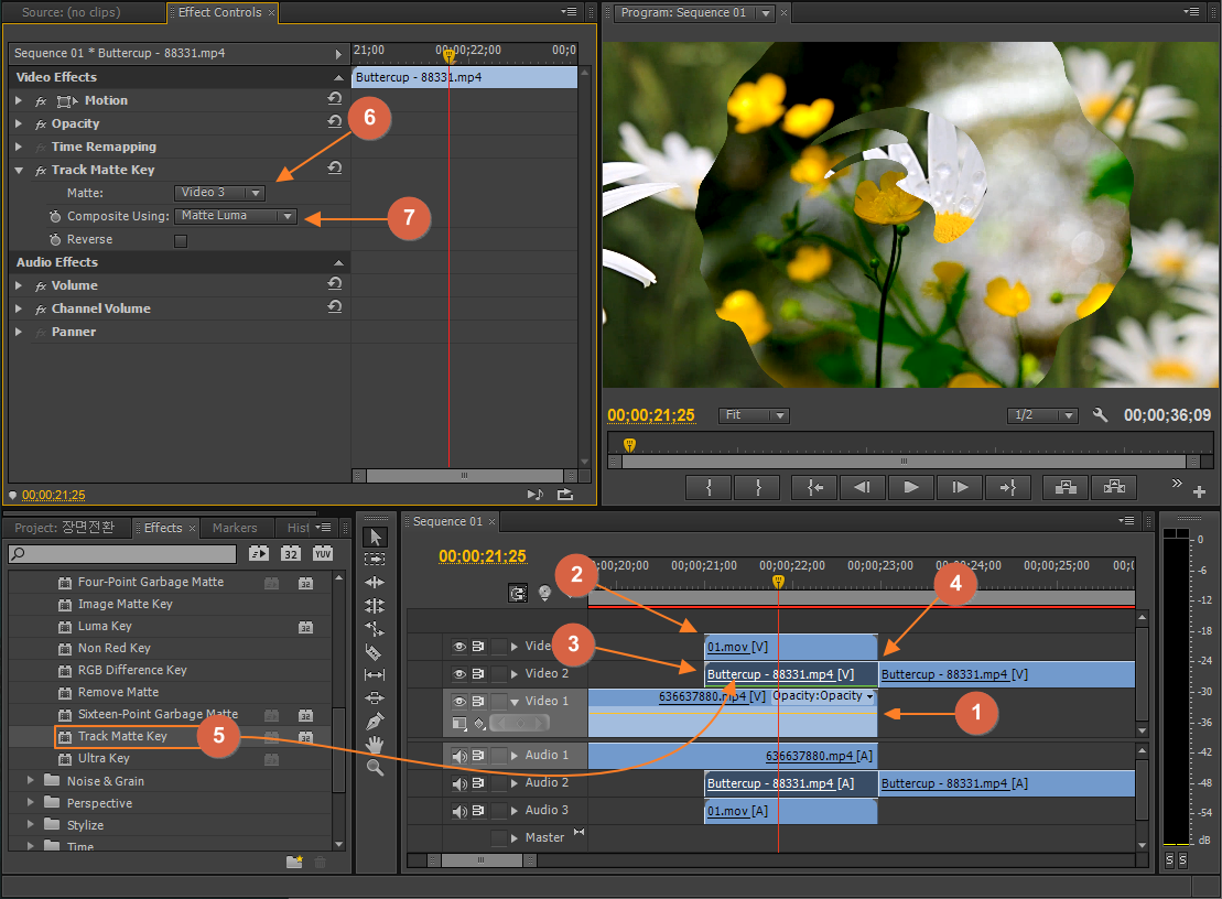 ⑥ Track Matte Key 효과에서 Matte를 효과 영상이 있는 Video 3을 지정합니다.