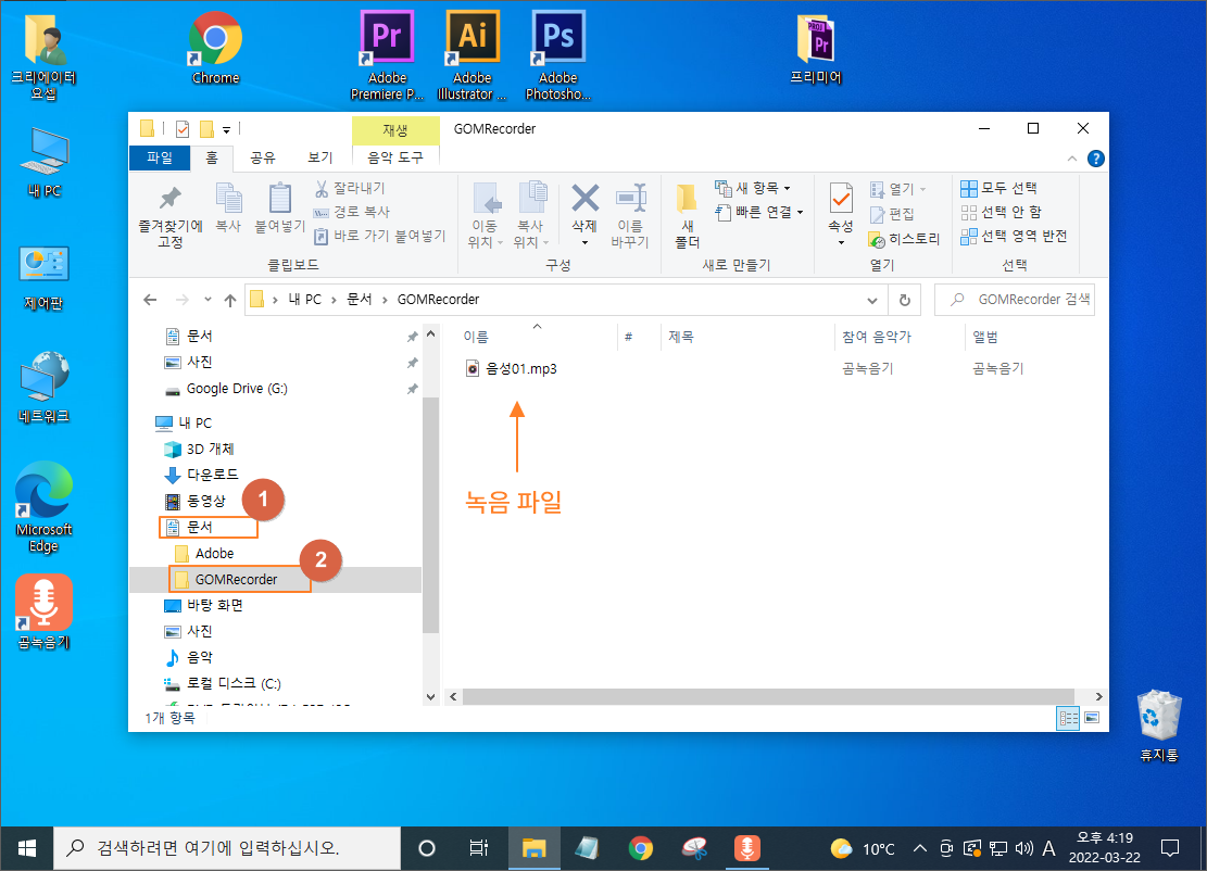 곰 녹음기로 녹음한 파일은 [문서] 폴더 안에 GOMRecoder 폴더에 들어있습니다.