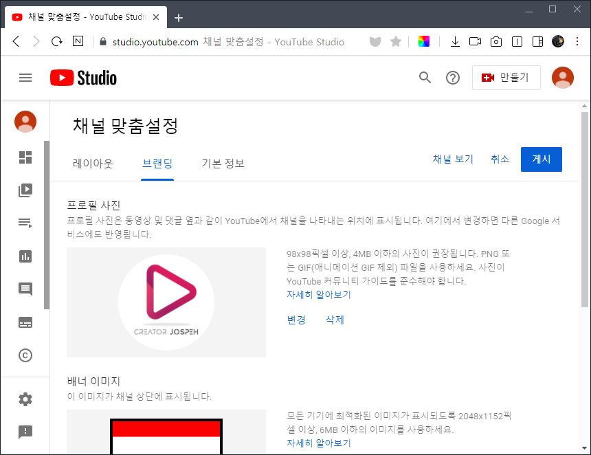 [ 채널 맞춤설정 ] 메뉴 눌러서 [ 브랜딩] 메뉴 눌러도 됩니다.